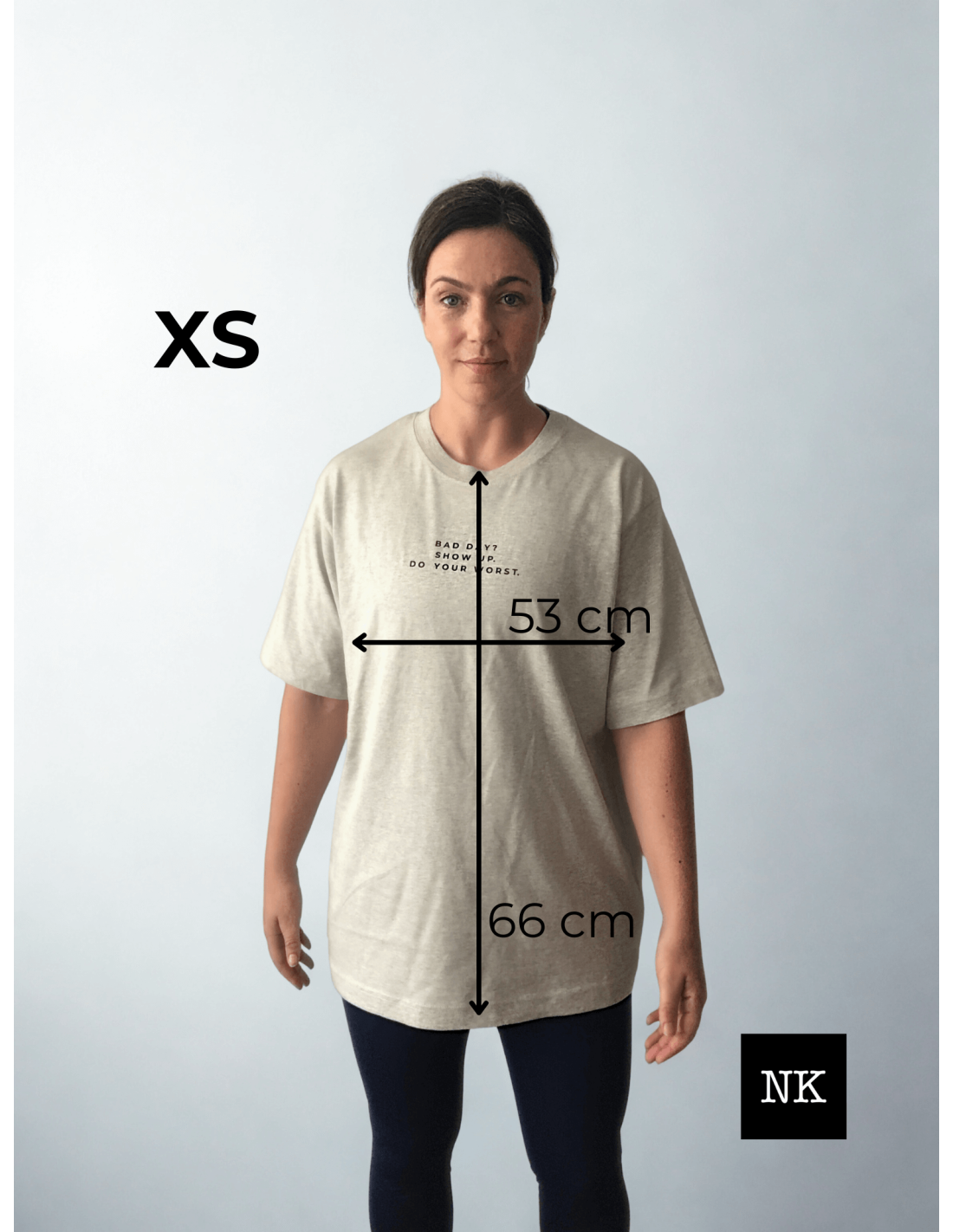 • Camiseta "Bad day? Show up" en color arena y letras negras.